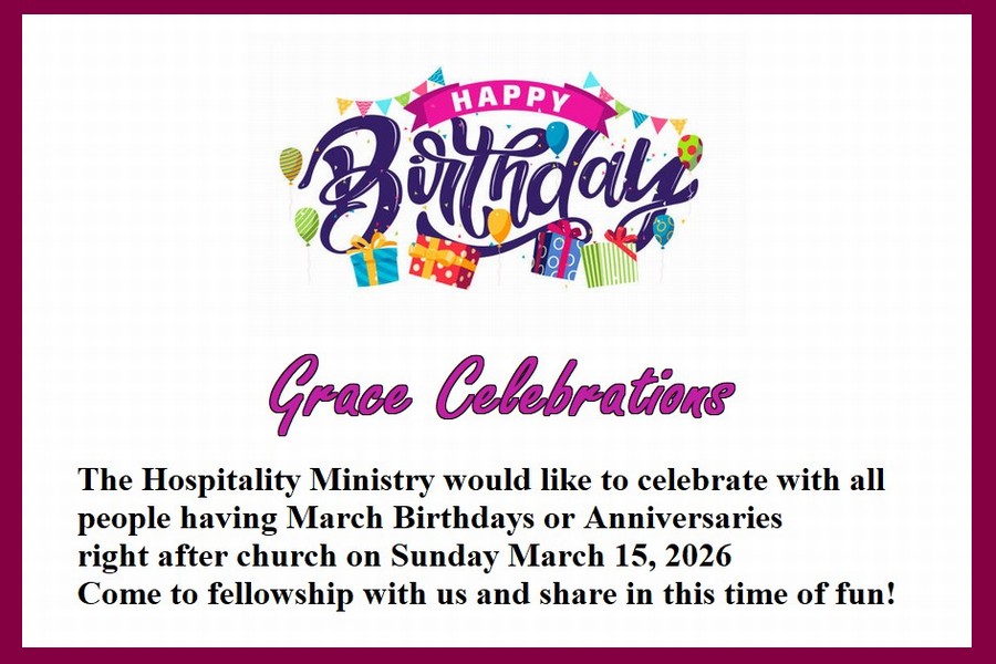 - Women’s Ministry: Saturday 3/14/2026 from 11am–1pm – Lower Level. It’s an important meeting for all Grace Sisters of all ages, so to all the beautiful Women of Grace, please bring someone with you!!!